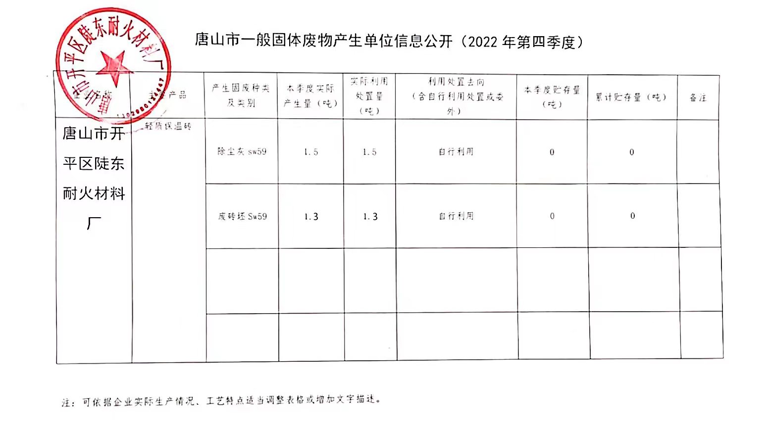 唐山市开平区陡东耐火材料厂2022年第四季度信息公开