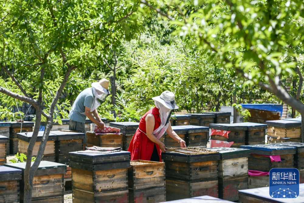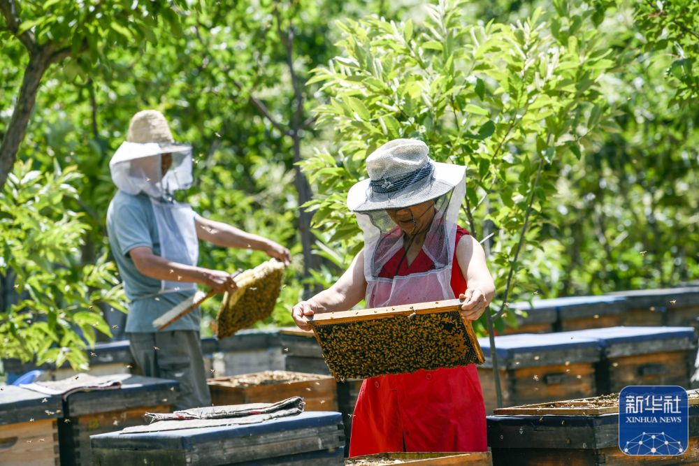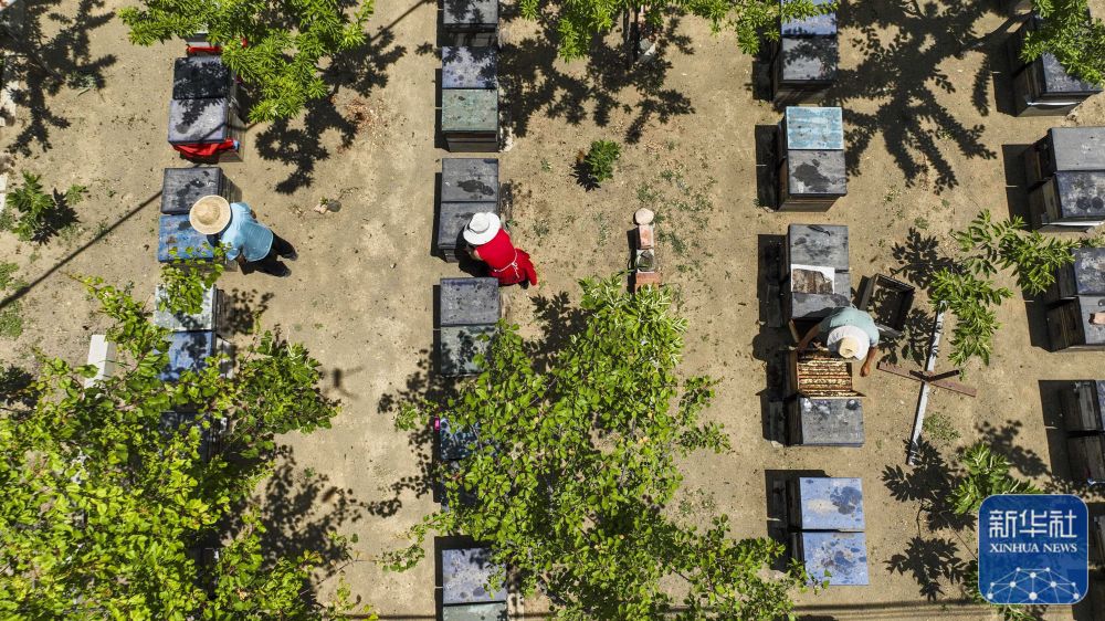 6月11日,河北省迁西县渔户寨乡农民在整理蜂巢。近年来,河北省迁西县农民充分利用山区树木品种多、花多的资源优势,积极发展林下养蜂产业,实现增收致富。新华社发(刘满仓摄)6月11日,河北省迁西县渔户寨乡农民在树下养蜂场查看蜂箱。6月11日,河北省迁西县渔户寨乡农民在树下养蜂场整理蜂箱(无人机照片)。6月11日,河北省迁西县渔户寨乡农民在树下养蜂场整理蜂箱。